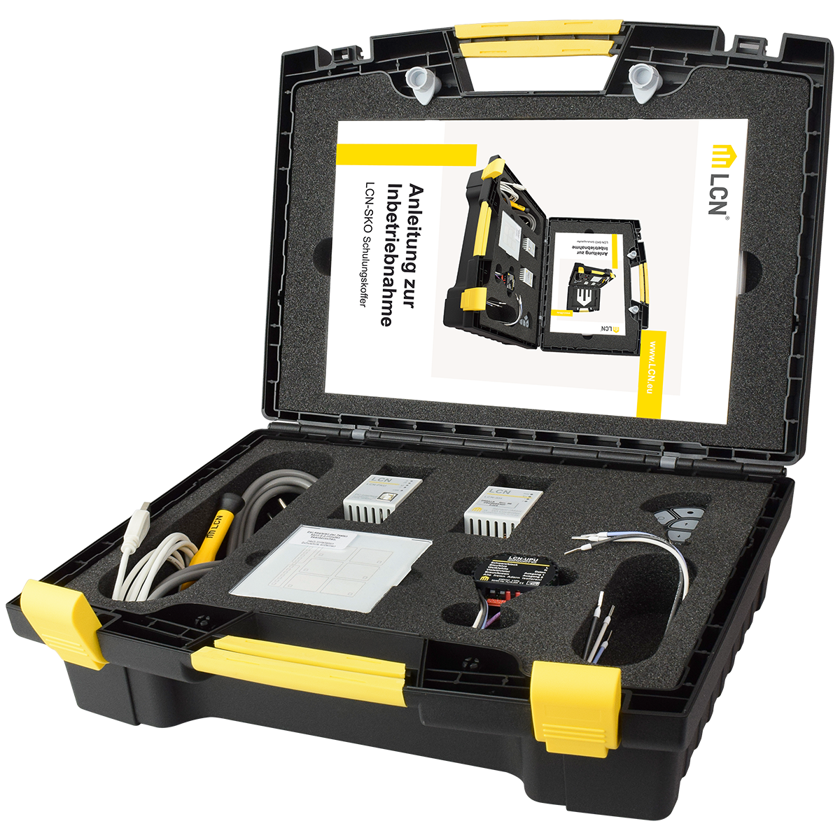 Der LCN-SKO ist der Schulungskoffer des LCN Bussystems. Dank der umfangreichen Grundausattung mit zwei intelligenten Bus Modulen, Tasterschnittstelle, Fernbedienung und IR Empfänger sowie des Koppelmoduls und der Software LCN-PRO ist der leichte Einstieg in die LCN Welt sicher.